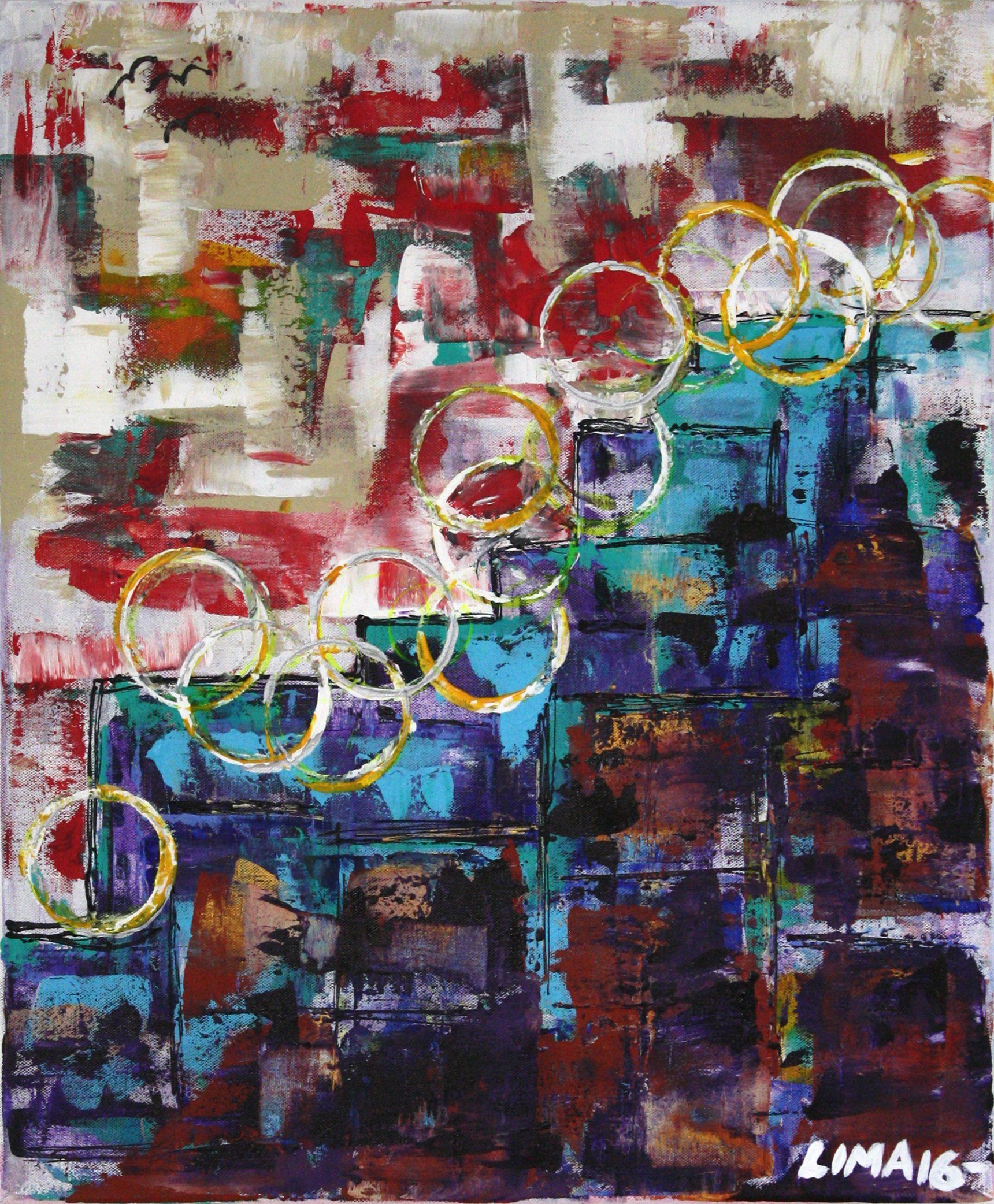 When you look at Bouncing Balls in the City, you have this abstract blue spirited skyline and some yellow and white trimmed balls out of nowhere completely out of place just having fun, spreading happiness and positivity, bouncing around, like they don't care, even if they don't belong there.