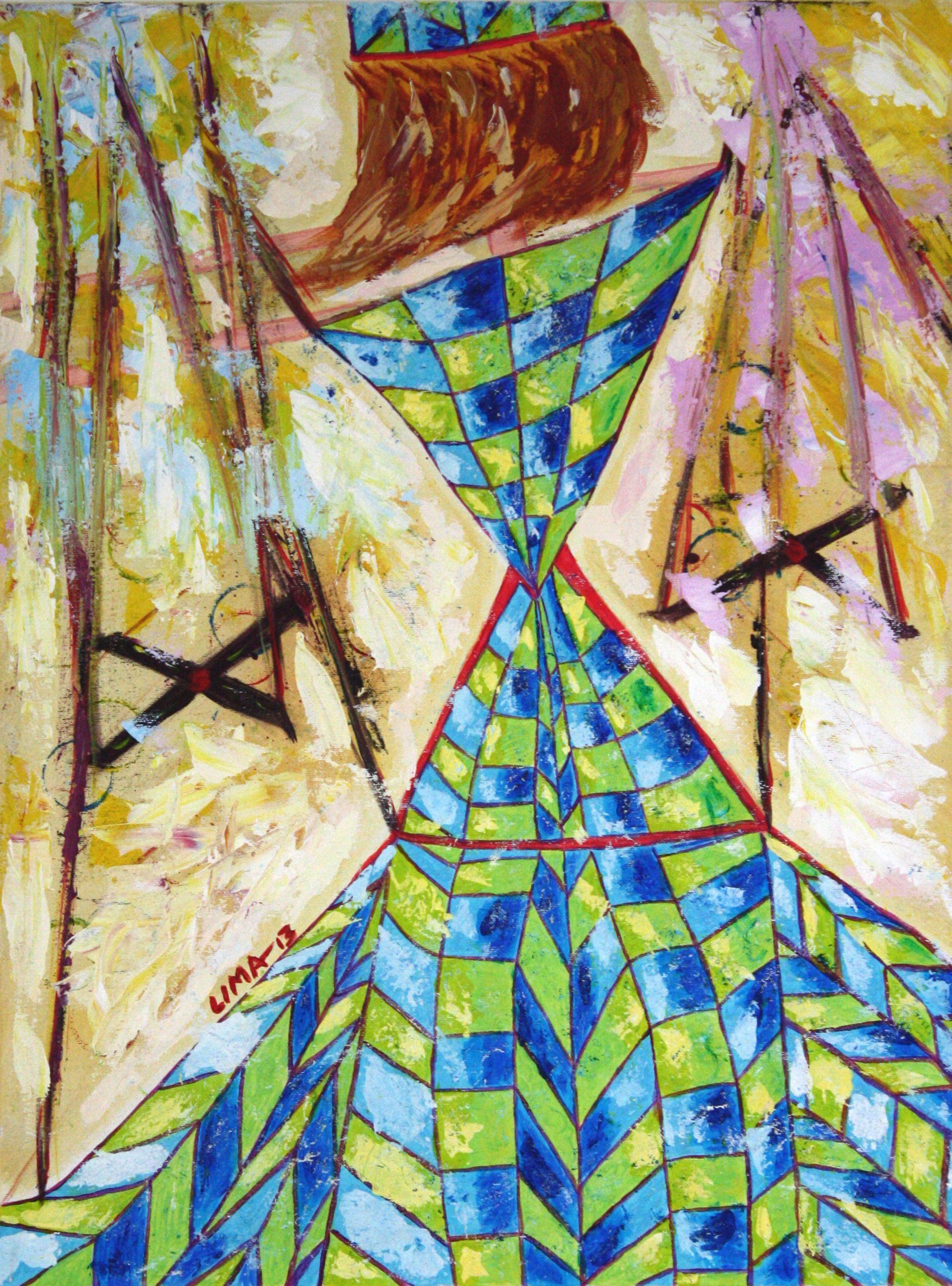The Hidden man shows an abstract face of a man hidden in a green field. His skin is of a rosy pink color that symbolizes youth, good health, romance and playfulness. He is flushed and shy as he is hiding and in love for the first time. He is hiding in a forest with many shades of green which symbolizes his powerful emotions, renewal and life. He is reborn in his passion for this special lady and feels at peace and secure in this new found love.