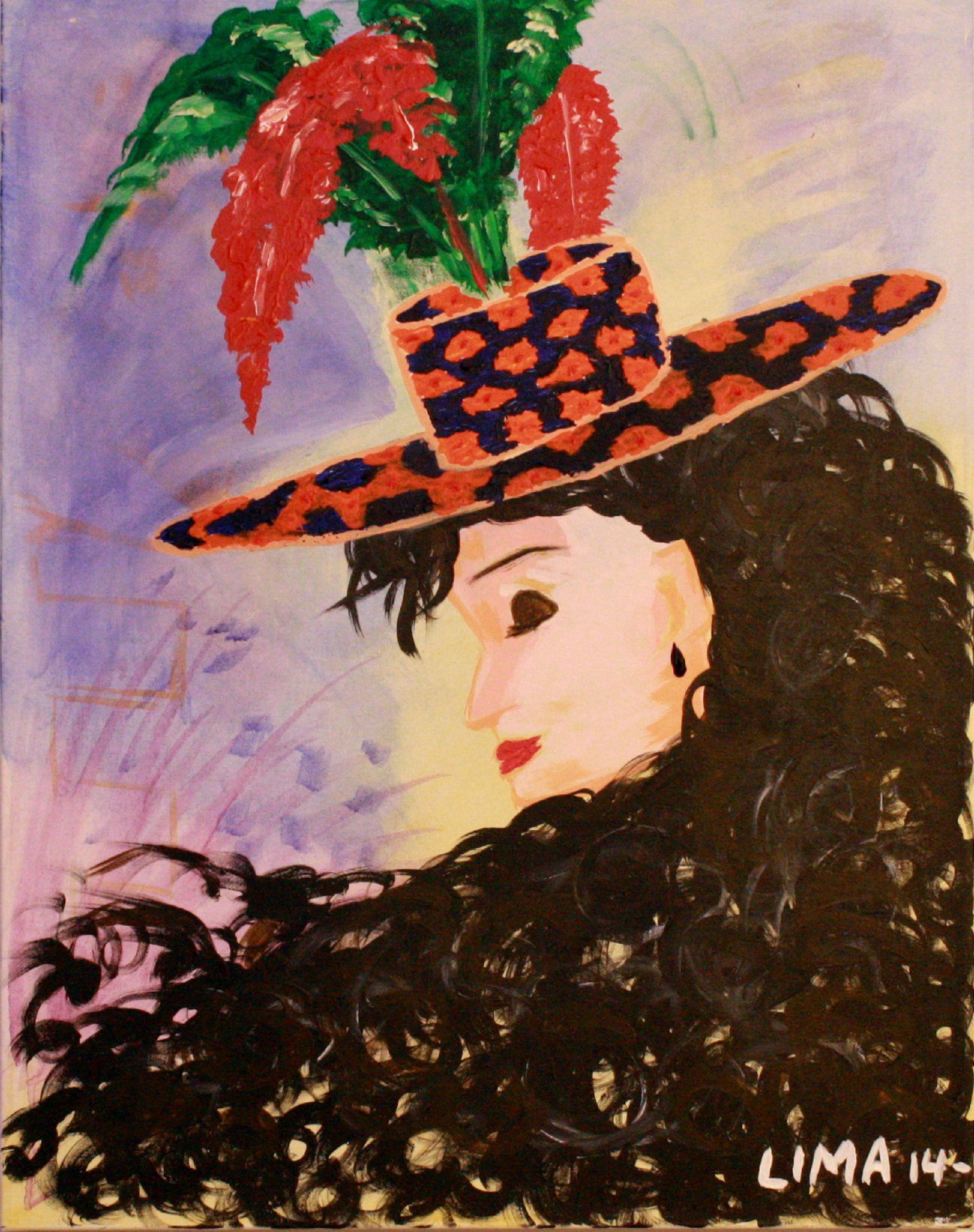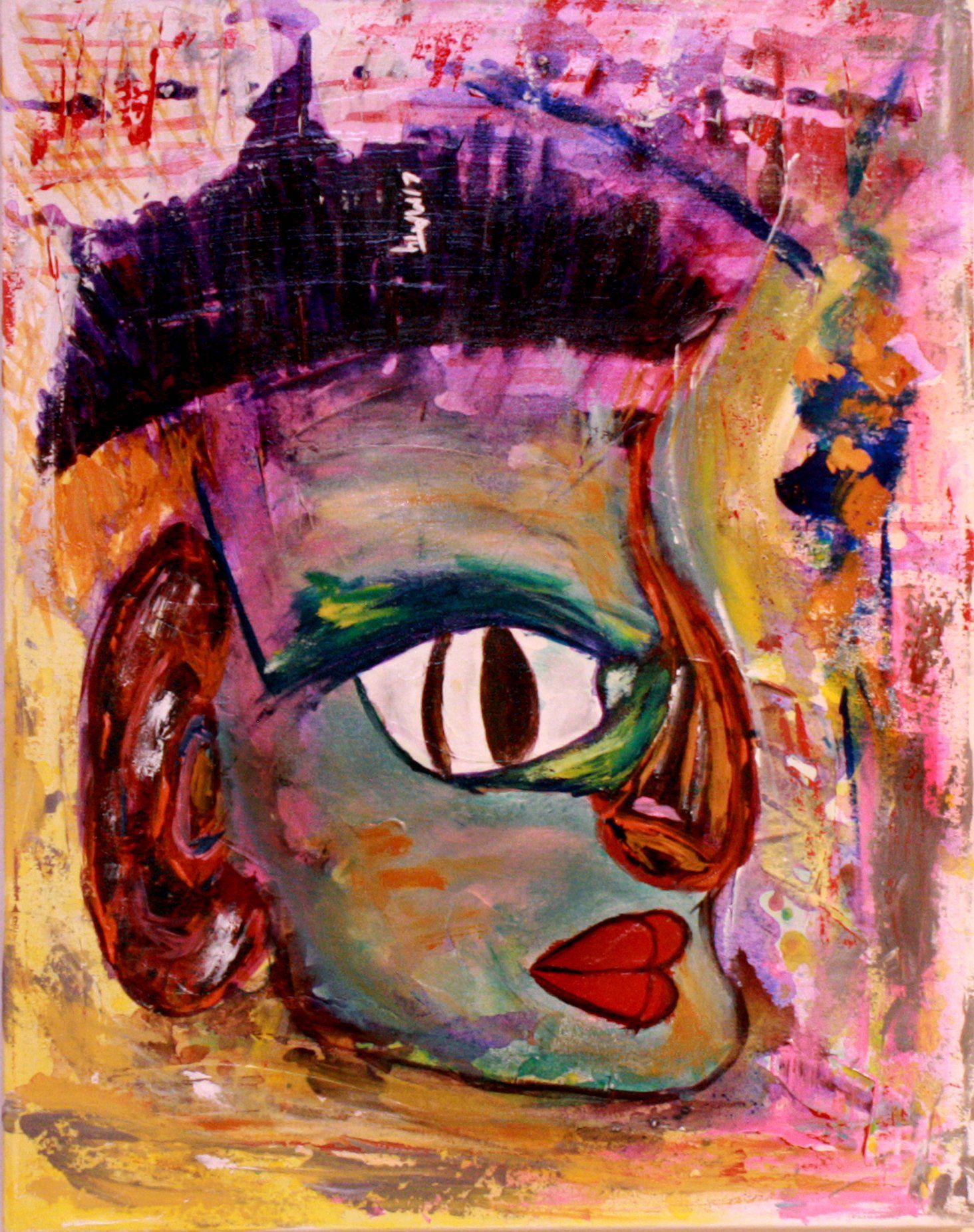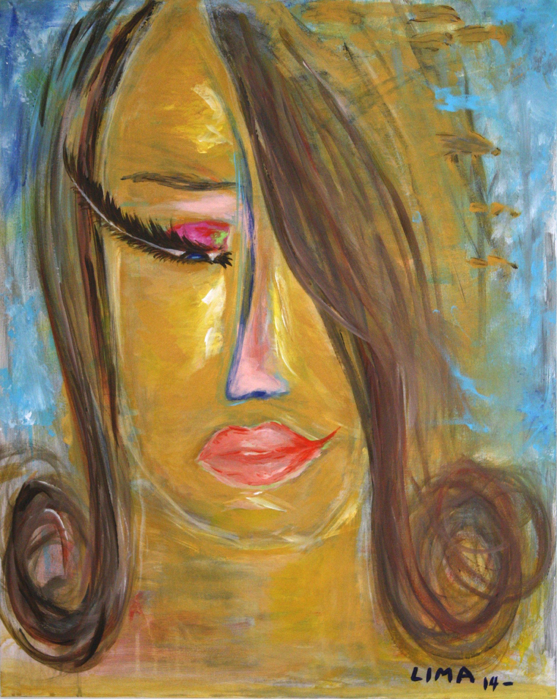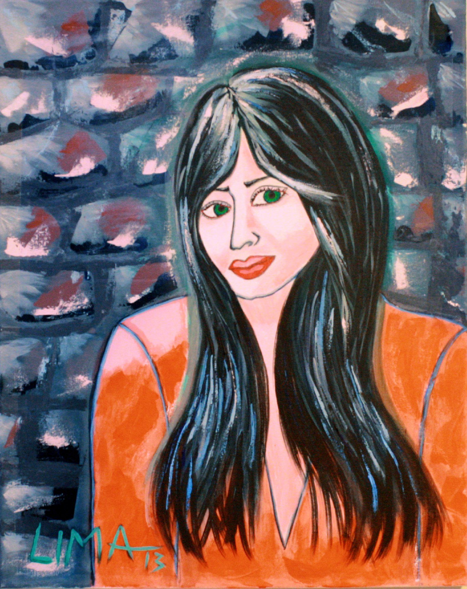 Her bright poppy eyes and faint green contour show a possibility, beginning of renewal and re-birth while her orange top which takes a hold of our gaze symbolizes creativity, a warm heart full of enthusiasm and her joy to come.