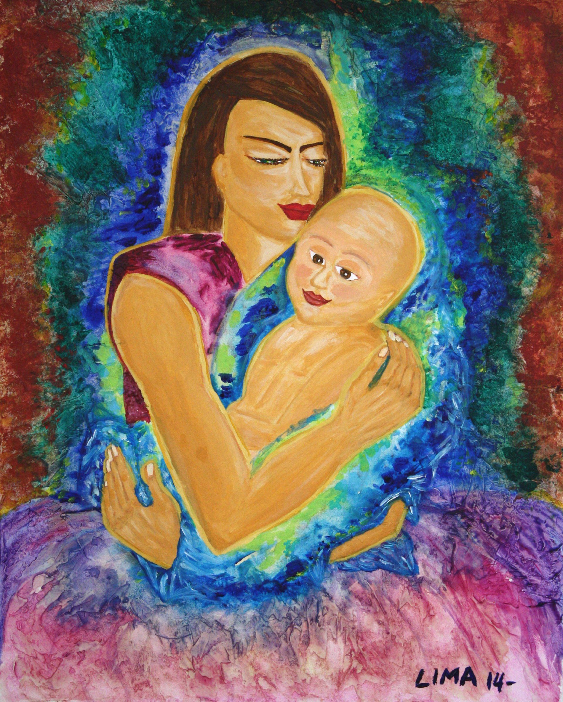 The colors around the mother, are her aura. Powerful colors like, green, yellow green, blue, rust orange. Her yellow and mustard outline symbolize complete happiness.