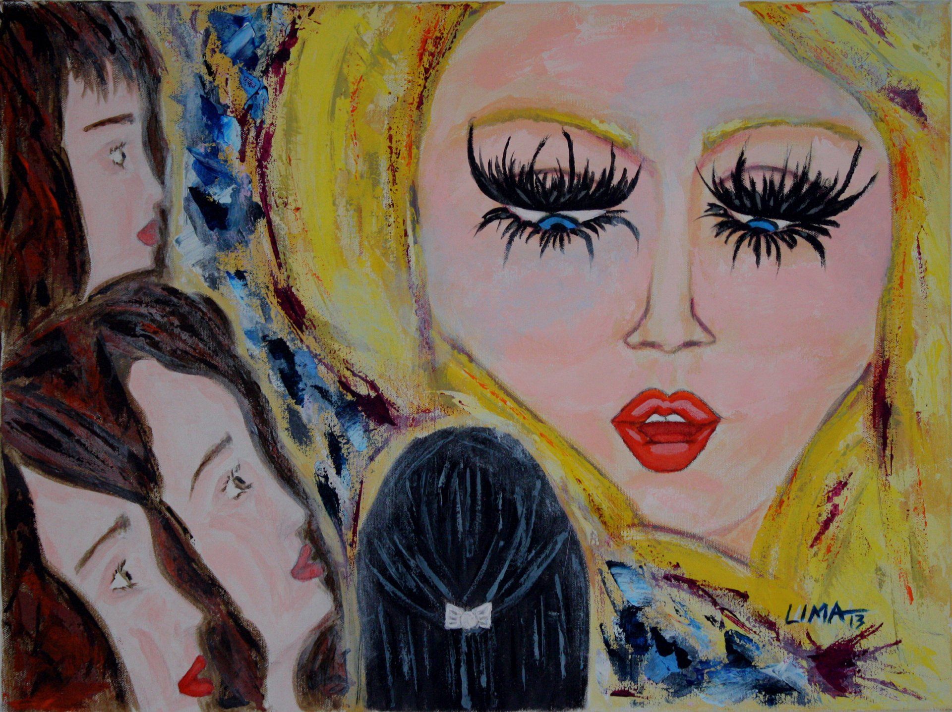 The main one is that there are many sides to us women. The brown hair color shows some down to earth qualities, while the black shows power + authority and the blond shows optimism + happiness.